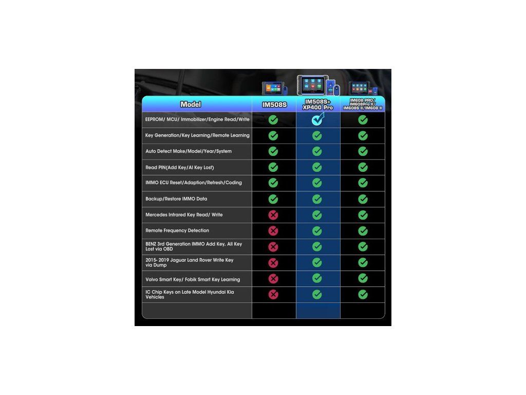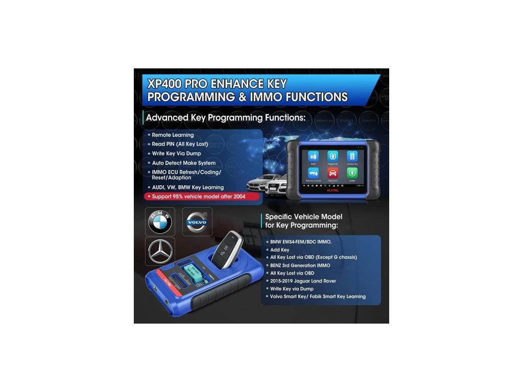 Programmer XP400 Pro výrazně rozšiřuje možnosti sady IM508S. Výrobce uvádí podporu pro rozšířené IMMO operace zejména u značek BMW, Mercedes-Benz a Audi, ale i u dalších evropských a asijských vozidel.
