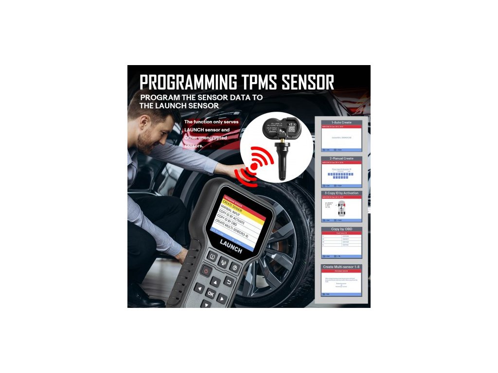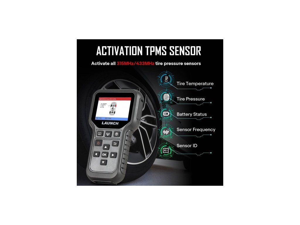 Launch CRT5011E je univerzální čtečka a programátor TPMS senzorů s podporou OBD2, navržená pro rychlou diagnostiku a správu tlakových senzorů. Umožňuje číst a mazat chyby, aktivovat nové senzory, resetovat systémy TPMS a zapisovat ID přímo do řídicí jednotky vozidla (ECU).