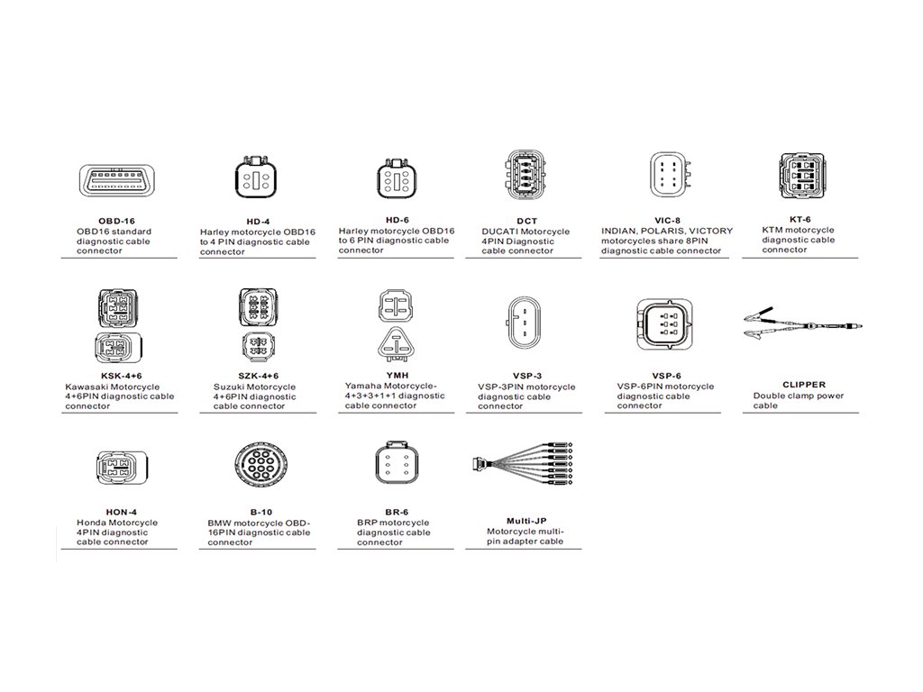 1pc x Main unit1pc x Main Diagnostic cable1pc x Type-C USB cable1pc x HD-4 adapter1pc x HD-6 adapter1pc x DCT adapter1pc x VIC-8 adapter1pc x KT-6 adapter1pc x KSK-4+6 adapter1pc x SZK-4+6 adapter1pc x YMH adapter1pc x VSP-3 adapter1pc x VSP-6 adapter1pc x HON-4 adapter1pc x B-10 adapter1pc x BR-6 adapter1pc x Clipper1pc x Motorcycle jumper Z1pc x Motorcycle jumper Y1pc x Motorcycle jumper 21pc x Motorcycle jumper 31pc x Motorcycle jumper 41pc x Motorcycle jumper 51pc x Motorcycle jumper 7
