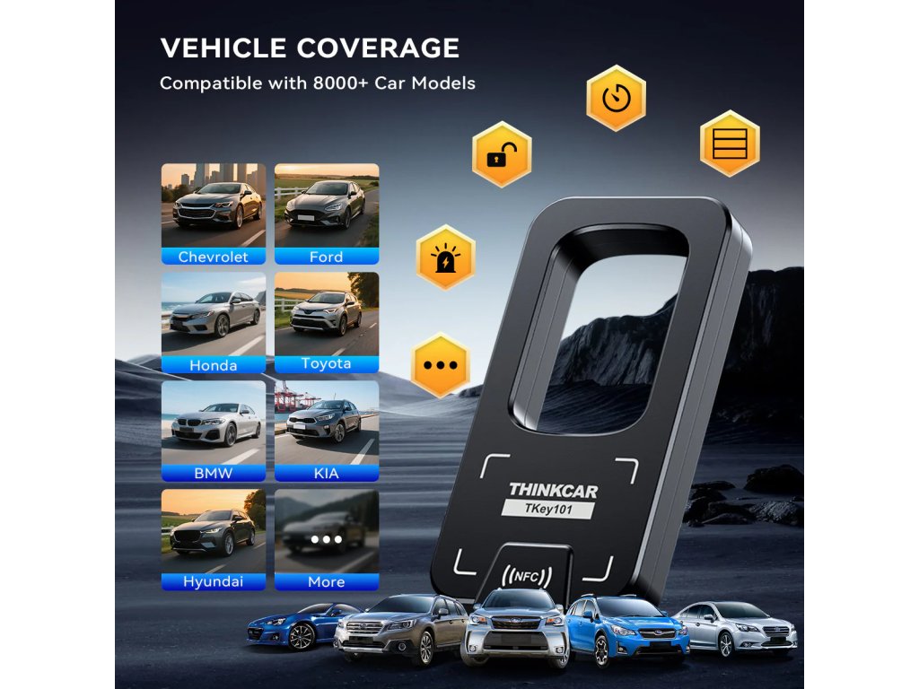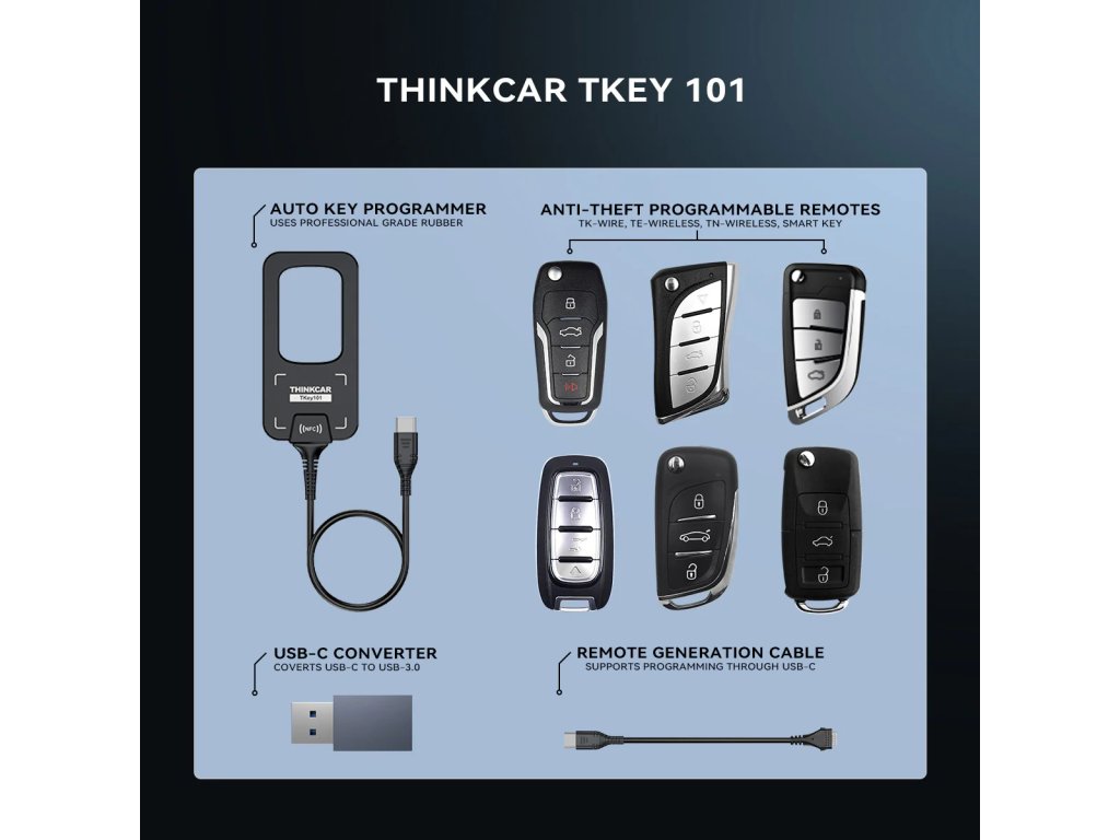 Thinkcar TKEY101 je praktický nástroj pro programování klíčů a dálkového ovládání, navržený jako doplněk k vybraným diagnostickým tabletům THINKCAR / MUCAR . Pomůže v situacích, kdy potřebujete přidat nový klíč, nahradit ztracený nebo řešit spárování dálkového ovládání – vždy podle možností konkrétního vozidla.
